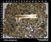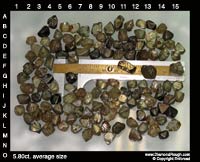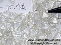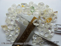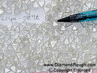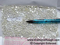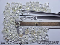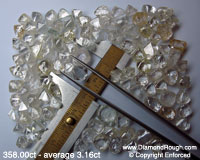 Example 04 Average size = 5.8 ct. The three larger stones sitting on the micrometer have an average size of 11 carats each. Octahedrons, some Macles and Dodecahedron, as well as a small percentage of Cleavage. |